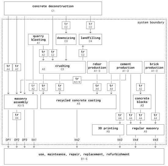 This strategy is an additional circular method for concrete construction, whose cycle in the concrete value chain is detailed in Figure 2. This strategy provides no disturbance to current demolition dynamics and constant availability of source material in recycling centres and landfills.