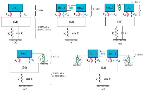 Schematic presentation for (a) TMD; (b) TTMD []; (c) ICTTMD [,]; (d) TMDI []; (e) TTMDI [].
