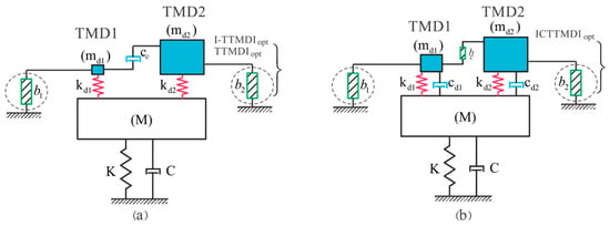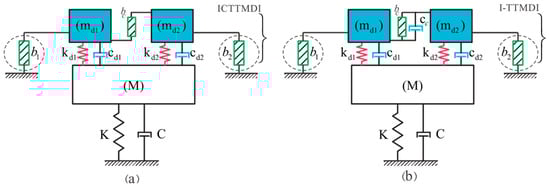 In order to address the abovementioned concerns, two new tandem-based configurations are proposed as modifications to the TTMDI (Figure 2). The first newly proposed configuration extends the TTMDI by replacing the dashpot with an inerter (i.e., the ICTTMDI (Figure 2a)), and the second integrated configuration, the I-TTMDI, not only represents all the previously presented configurations but also includes other possible tandem-based configurations (Figure 2b). In the newly introduced configurations, the mass and inertance ratios are also assumed to be part of the optimization variables, in which the total mass and inertance are optimally distributed in the process. Therefore, the most efficient configurations without any predefined constraints on the mass and inertance distributions can be achieved in a uniform optimization and evaluation framework.