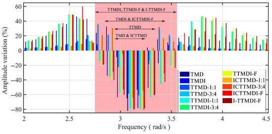 To this end, Figure 4 shows the JF2 variation in the vicinity of the fundamental frequency of the uncontrolled system (3.14 rad/s) for all the control devices. The positive and negative values of the ordinate show the increases and decreases in the frequency response with respect to the uncontrolled system, respectively. Therefore, the pink shaded region (between 2.8 and 3.5 rad/s) indicates the frequency band within which some devices started to show a more efficient performance than that of the uncontrolled structure. Nevertheless, outside this region, all the configurations increased the frequency response with different amplitudes. The effective operating frequency bands of the devices are depicted in this figure with the solid, horizontal, two-sided arrows.