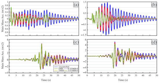Acceleration response histories of the uncontrolled and controlled SDOF subjected to four different earthquakes: (a) EQ7, (b) EQ12, (c) EQ18, and (d) EQ20.