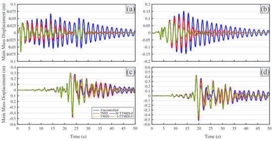 Displacement response histories of the uncontrolled and controlled SDOF subjected to four different earthquakes: (a) EQ7, (b) EQ12, (c) EQ18, and (d) EQ20.