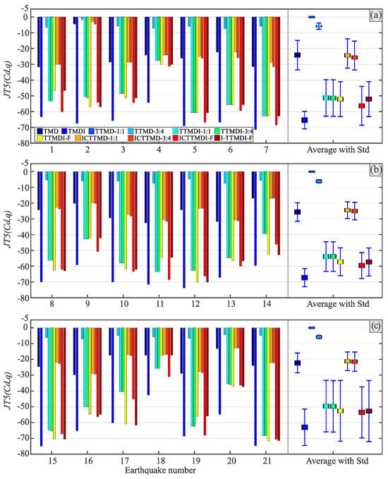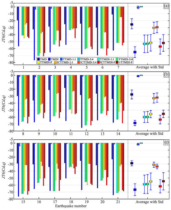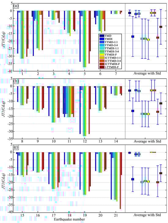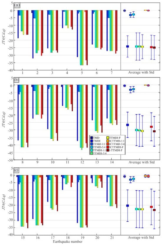 Considering the absolute accelerations of the main mass, Figure 9 and Figure 10 depict the reductions in the maximum and norm of the main mass absolute acceleration, respectively, for each device under all three record sets. All devices exhibited utterly different behaviors under different records in a group, indicating that all the instruments depended on the specifications of the record and, in particular, its frequency content, as previously highlighted in studies by De Domenico and Ricciardi [] and Dai et al. []. In Figure 9, the maximum reduction in the JT3 was about 31% (using either the TTMDI-F or I-TTMDI-F) under all record sets. A comparison of the means of the performances for the individual devices under different record sets demonstrates that the maximum reduction in the JT3 has a more uniform pattern. Therefore, the control devices can be divided into two categories based on their performances in the reduction in the means of maximum acceleration. These categories are TMD-based control devices and TMDI-based control devices, and their related reductions are under 3% and about 15%, respectively. Furthermore, the standard deviations show a more uniform pattern for the maximum acceleration reductions, with small and large standard deviations for the TMD-based and TMDI-based configurations, respectively. In Figure 10, the maximum reductions in the JT4, the norm of absolute acceleration, were approximately in the range of 35–43% (using either the TTMDI or I-TTMDI) under all record sets. Additionally, the reductions in the norm of absolute acceleration (JT4) for the TMD-based and TMDI-based devices are similar to the reductions in the norm of displacement (JT2).