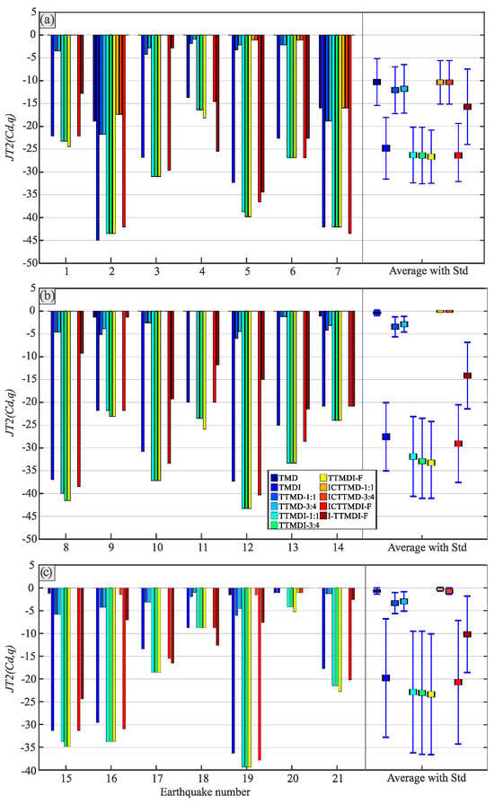 The results of the reductions in the norm of the displacement (JT2) are presented in Figure 8, where a similar trend for reducing the norm of the displacement is observed, with the TMDI-based devices showing consistently superior performances; however, the devices generally exhibited enhanced performances (between 5 and 15%) in comparison with those for the JT1, indicating their better effectiveness at controlling the overall vibrations rather than just the peak responses. These observations align with the findings from previous studies on TMDI-based devices by Pietrosanti et al. [], which showed that incorporating the inertance provides more effective displacement mitigation under various seismic records. Moreover, a similar categorization can be suggested for the TMD-based control devices (i.e., the TMD, TTMD, and ICTTMD), the I-TTMDI, and all the rest of the TMDI-based devices. Although the performances of all the categories increased in reducing the JT2 in comparison with the JT1, the TMD-based devices show mean values closer to zero with larger standard deviations, demonstrating that their performances remained almost unchanged under NF records with FD and FS. This pattern stems from the inherent limitation of the TMD-based devices when addressing the wideband frequency contents of these records.