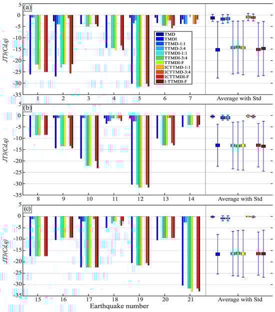 The four displacement and acceleration criteria indicate the control performance of each device in comparison with the corresponding values of the least effective control device among all the studied devices to provide a suitable indicator for comparing the control capabilities of the different devices. These are defined according to Equations (6)–(9), where Cd is the control device number: 1, …, 11; q is the earthquake number: 1, …, 21; t is the time: 0 ≤ t ≤ Tq; d and a are the displacement and absolute acceleration of the main mass, respectively; and and express the absolute value and norm of the responses, respectively: