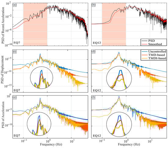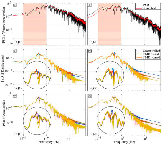 Figure 11a,b illustrate the PSD values of EQ7 and EQ12, respectively, where the smoothened form that is calculated by the moving average is also presented in red for further comparison purposes. Similarly, Figure 12a,b show the PSD values of EQ18 and EQ20 and their smoothened curves, respectively. The region of structural importance (shaded area) shows that by decreasing the frequency, the PSD values of EQ7 and EQ12 decrease with a significant slope, while EQ18 and EQ20 do not exhibit such trends. For the latter two records, the PSD changes were much less sharp, and even the PSD of EQ20 remained almost constant with the decreasing frequency. In the second (part c and d) and third (parts e and f) rows of Figure 11 and Figure 12, the PSD values of the displacement and acceleration of the main mass under the corresponding records are presented, respectively.