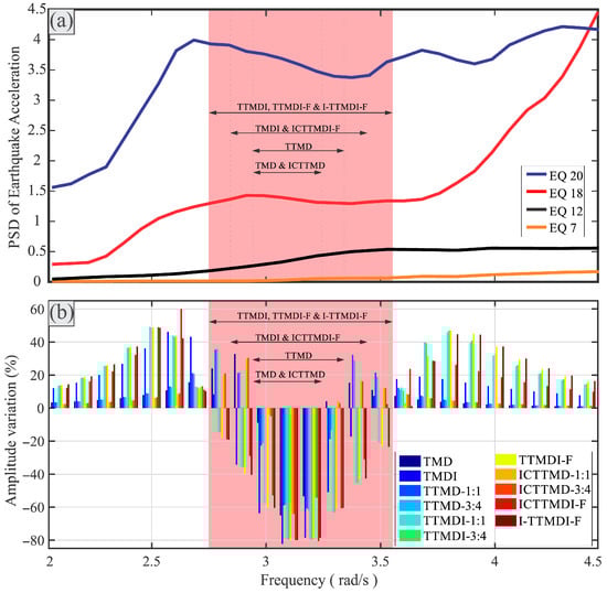 Figure 7, Figure 8, Figure 9 and Figure 10 show that the control devices performed differently under different earthquake records; e.g., most devices had excellent performances under earthquake record 12 (EQ12), while the performances of the same devices under EQ18 were unsatisfactory. As mentioned previously, these different and sometimes contradictory performances are usually attributed to the interaction of the record frequency content and the system frequency response, which is a function of the modification of the dynamic characteristics of the controlled system. Therefore, before evaluating the strokes of different control devices, in the next section, the PSDs of the earthquake records, as well as the PSDs of the displacement and acceleration of the main mass under selected records, are compared to give some insight into the different and contradictory behaviors of the control devices under different ground motions.
