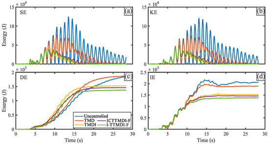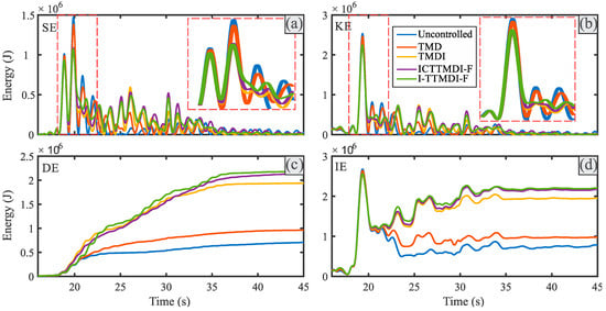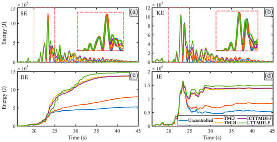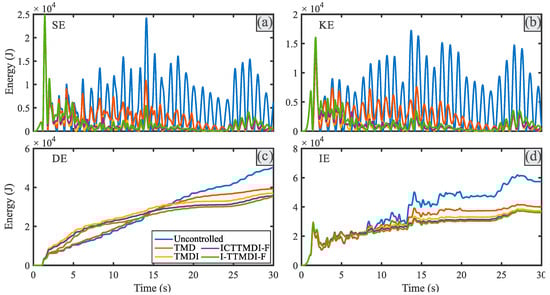 Similar results can be deduced more clearly from the DE and IE energies (the plots of (c) and (d), respectively). The amounts of these energies for the various control devices under EQ7 and EQ12 are different from those under EQ18 and EQ20. Accordingly, it can be observed that, generally, under EQ7 and EQ12, the uncontrolled and I-TTMDI-F controlled structures had the largest and smallest energies, respectively, during the entire duration of the records, and particularly at the end section of the records. Similar results were observed in the study conducted by Zhao et al. [], which highlighted the intrinsic ability of inerter-based tuned mass dampers to effectively reduce the input energy. To the contrary, opposite trends were observed in the cases of EQ18 and EQ20. This could be justified based on Figure 12, where a device with a larger effective operating frequency band shows the worst performance outside its bandwidth. Therefore, they even could exacerbate the responses if the energies of the records remain unchanged or increase outside their effective operating frequency bands. Similar results for the other records can be presented but are omitted herein for the sake of brevity.