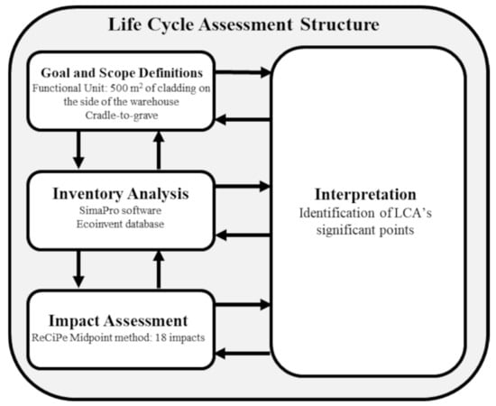 There is still a lack of comprehensive studies focusing specifically on warehouses, particularly those using steel structures and cladding systems. Many existing works analyze isolated stages of the life cycle, prioritize operational energy, or address specific regional contexts without providing a complete cradle-to-grave perspective. Additionally, few studies compare multiple design alternatives for the same functional use, which limits the ability to identify trade-offs and best practices in material selection. The literature also reveals limited integration of multiple environmental indicators beyond carbon emissions, such as resource depletion or ecosystem impacts, which are essential for more robust sustainability assessments. As a result, there remains a knowledge gap regarding how different design configurations—especially cladding systems—influence the environmental performance of steel warehouses across their entire life cycle.