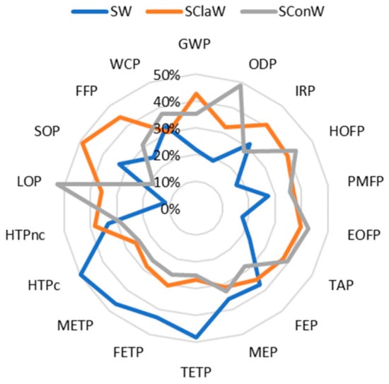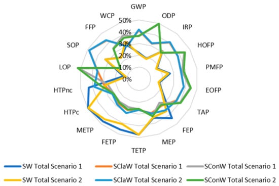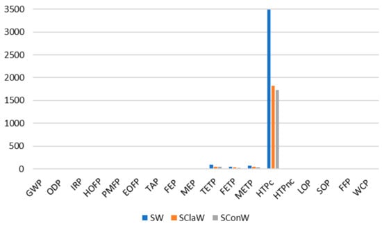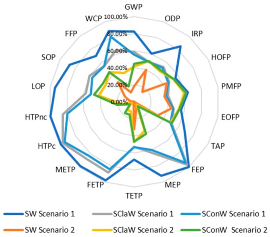 As shown in Figure 6, the SW Project under end-of-life Scenario 2 demonstrated the best environmental performance, with notably lower impacts in nine categories related to atmospheric emissions (“Global warming potential”, “Stratospheric ozone depletion”, “Ozone formation—human health”, “Fine particulate matter formation”, “Ozone formation—terrestrial ecosystems”), human health (“Human non-carcinogenic toxicity”), and land use and natural resources (“Terrestrial acidification”, “Land use”, “Fossil resource scarcity”). The SConW Project under Scenario 2 showed lower environmental impacts in seven categories associated with toxicity (“Terrestrial ecotoxicity”, “Freshwater ecotoxicity”, “Marine ecotoxicity”, “Human carcinogenic toxicity”, “Freshwater eutrophication”), radioactivity (“Ionizing radiation”), and mineral resource use (“Mineral resource scarcity”).