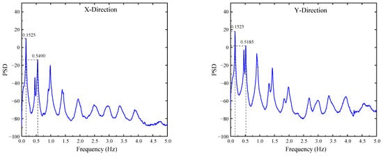 - The outcomes of identifying the first two-order natural vibration frequencies of the structure using the Peak Picking method, the curve method, and the standard deviation method are largely consistent. This suggests that both the curve and the standard deviation methods are capable of precisely identifying the modal parameters of the structure. The specific identification results are as follows: The first-order natural vibration frequencies of the building in the X- and Y-directions are approximately 0.151 Hz and 0.153 Hz, respectively, and the second-order natural vibration frequency is around 0.456 Hz. In the absence of the influence of the two active mass-tuned dampers, the first-order and second-order damping ratios of the structure in both directions are less than 1.000%.