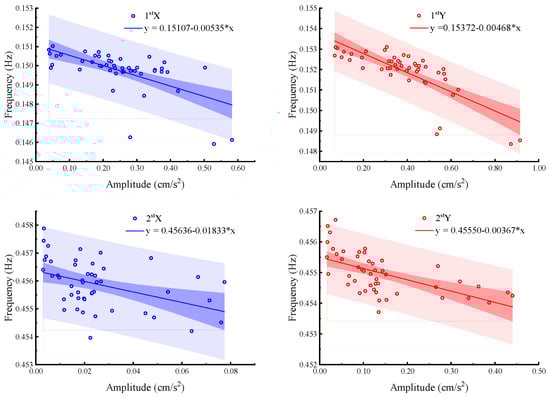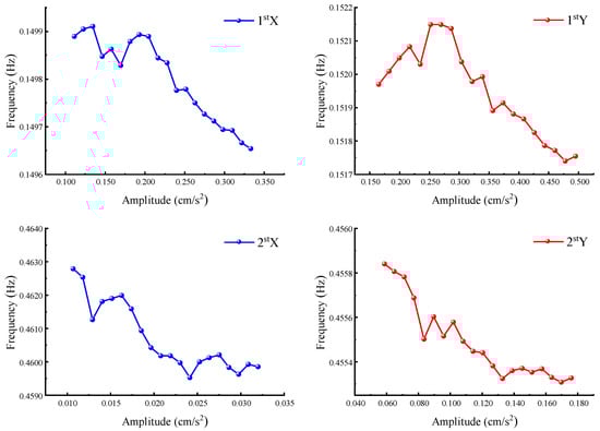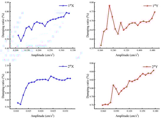 - The results derived from the curve method and the standard deviation method demonstrate the amplitude dependence of the natural vibration frequencies and damping ratios of the building. The first two-order natural vibration frequencies in both directions of the structure decline as the amplitude increases, whereas the first two-order damping ratios rise with the growth of the amplitude.