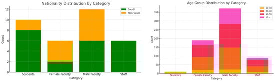 A total of 1186 individuals participated in the survey, including 537 students, 560 faculty members, and 89 staff members, to assess satisfaction with key campus design elements. It included Likert-scale questions for quantitative evaluation and open-ended responses for qualitative insights, distributed both online and on-site. The study focused on enhancing social life, promoting environmental sustainability, and strengthening student-centric design, ensuring alignment with evaluation criteria. Among students, all were aged 20–30, with 516 Saudis and 21 non-Saudis. Faculty members represented diverse age groups, with female faculty primarily between 31 and 50 years and male faculty more evenly distributed across 20–51+ years. Staff members were mostly aged 31–50, with 73 Saudis and 16 non-Saudis. Participants rated the accessibility and effectiveness of campus amenities, entertainment spaces, community activities, green spaces, climate-responsive design, resource management, and technology integration. These responses provided valuable insights into user experiences, revealing areas for potential improvement in campus facilities and services. See Table 4 and Figure 4.