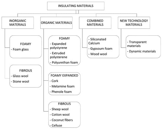 At the EU level, the building sector represents more than 40% of the total energy consumption [], and half of that is utilized in space acclimatization and lost to the environment [,]. Hence, having in mind the enhancement in energy efficiency and decrease in the environmental impact of building operation, the importance of insulation materials for buildings and industrial facilities is growing []. Insulation materials are classified by their chemical or their physical structure as illustrated in Figure 1. In the European market, the dominant isolation materials are inorganic fibrous materials (e.g., stone wool and glass wool) and organic foamy materials (e.g., expanded polystyrene and extruded polystyrene). In this context, “organic” refers to carbon-based materials, often from petroleum, including synthetic polymers like expanded polystyrene (XPS). While chemically organic, these materials are synthetic, unlike biologically organic materials such as cork or cellulose. Each group represents about 60% and 30%, respectively, while all other materials accounted for less than 13%, the corkboard insulation included [].