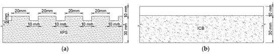 In this study, two different thermo-insulating materials of 30 mm thicknesses each were analyzed: a rigid extruded polystyrene foam (XPS) board with a grooved surface finish on one face and expanded cork agglomerate (ICB), standardized according to EN 13164:2013 [] and EN 13170:2013+A1:2015 [], respectively. Based on their corresponding technical sheets, the main properties of the insulation materials used for this study are displayed in Table 2.