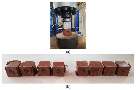 The uniaxial compressive strength (UCS) was assessed using eight cubic specimens (50 × 50 × 50 mm3) divided into two batches of four specimens each to evaluate consistency. The tests were performed at 28 days (Figure 4). The UCS was determined by adapting the methodology proposed in ASTM C39/C39M-18 []. A monotonic displacement rate of 0.005 mm/min and an actuator of a load capacity of 300 kN were used (Figure 4).