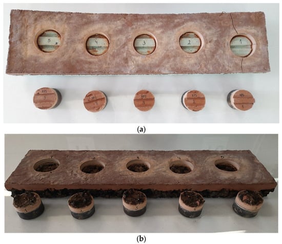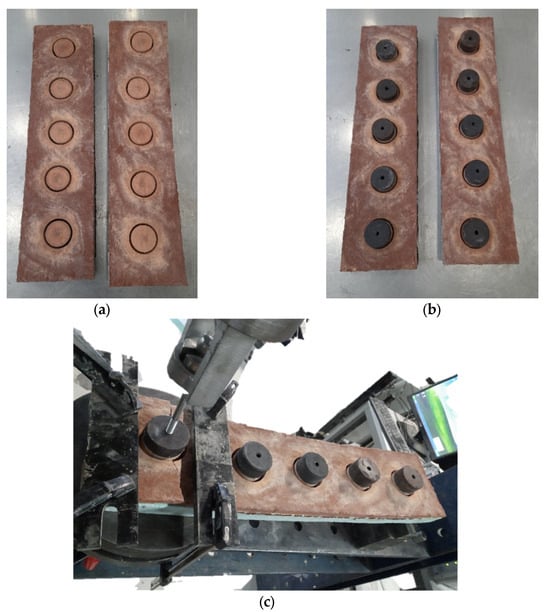 To ensure a final AAc thickness of 10 mm, PVC profiles (40 mm in height) were glued to the insulation material, and the excess mixture was removed with a plain spatula to achieve a smooth surface. Before testing, five equidistant circular cuts (50 mm diameter, 10 mm depth) were made per specimen on the AAc face of the panel, with 50 mm spacing between cuts (Figure 5a).