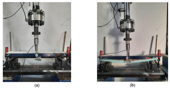 Experimental set-up of the three-point bending test on half-sandwich AAc panels with different thermo-insulating materials: (a) extruded polystyrene (XPS) and (b) insulation corkboard (ICB).