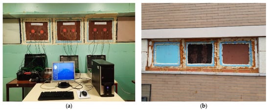 This experimental test was carried out in a test room with dimensions of 4.0 m × 3.0 m × 2.5 m (length × width × height). The set-up preparation first includes the replacement of the existing windows on the test room façade by an XPS board with dimensions of 3 cm × 76 cm × 64 cm (thickness × width × height), which framed and held the APXPS, the APICB, and the AAc uninsulated panel. Next, the panels were positioned in the test room to be north-facing and were simultaneously analyzed, allowing us to compare the thermal performance of the three different samples. The alkali-activated cement layer of the panels was placed towards the interior of the room (Figure 8a), and consequently, the face of the insulation materials was exposed to the exterior environment (Figure 8b). Then, each sample was meticulously sealed with the aid of polyurethane foam (PU) to avoid thermal bridges and noninsulated headers to ensure the absence of leaks and the experimental test’s reliability.