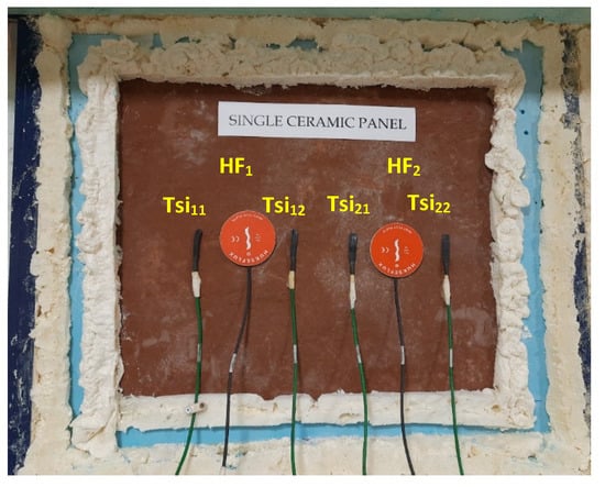 The equipment used for the experimental work includes three heat flux systems; each one comprised a datalogger, two Hukseflux HFP01SC plate sensors (HF1 and HF2), and four inner surface temperature sensors (Tsi11, Tsi12, Ts21, and Tsi22), which were fixed on the inner surface of each panel to measure the heat flux (q1 and q2) and the inner surface temperatures, respectively (Figure 9).