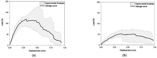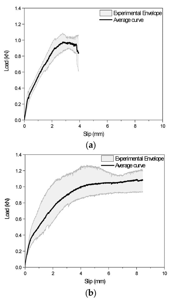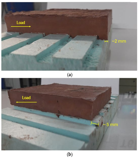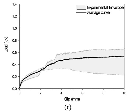 In general, when the load was applied along the direction perpendicular to the grooves of the XPS, it was distinguished as an initial linear branch followed by a nonlinear section up to the peak load (Figure 12a). The test was stopped when the load remained more or less constant at an average slip of 8.5 mm, and a displacement of the AAc layer of about 2 mm was observed (Figure 13a). In this case, the perpendicular grooves of the XPS provided a mechanical interlock between the two components. When the load was applied in the parallel direction of the grooves of the XPS, a linear phase was also observed. However, the peak load occurred at an average relative displacement of 3 mm, significantly lower than the one for (Figure 12b). This was expected, since for the interfacial bond behavior was governed by chemical and frictional adherence, while for there was the additional contribution of the grooves, which act as mechanical reinforcement mechanisms. Afterward, it was followed by a sudden softening branch attributed to the unstable debonding process at the interfacial layer. The load was removed when the skin layer of slipped approximately 5 mm (Figure 13b).