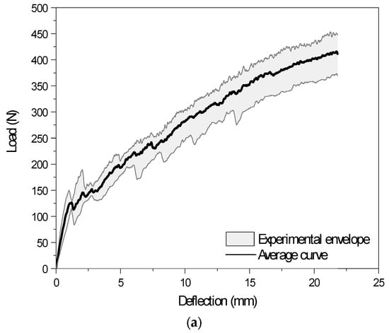 Figure 14 displays the load–deflection curves of the two types of half-sandwich panels. In general, the two tested half-sandwich panels exhibited quite distinct flexural behavior, which can be ascribed to the distinct mechanical properties of the insulation materials, although these are mostly due to the distinct equivalent height of the reinforced AAc layer of the panel’s cross-section that will consequently translate to a higher flexural capacity.