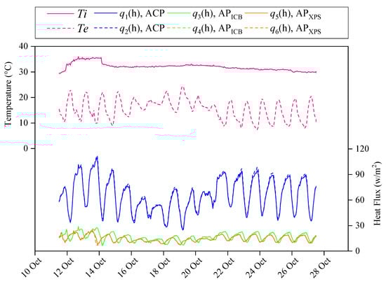 For a multi-layer panel, thermal properties can be represented by the thermal transmission coefficient (U), defined as the heat flow that passes through a unit area of a complex component or inhomogeneous material due to a temperature gradient equal to 1 K []. For the assessment of U values for APXPS, APICB, and ACP panels, the ISO 9869 guidelines [] were followed. Thereby, some assumptions have been considered to characterize the thermal performance of the investigated panels using a heat flow meter. Firstly, assessing the temperature values on both sides of the sample and the average of the heat flow rate over an adequately long time provides an acceptable estimate of the steady-state conditions. The measurement period is defined based on the thermal inertia of the element under analysis; for high-inertia elements, a measurement period of 14 days is required, while for low-thermal-inertia ones, a minimum of 72 h is acceptable. Given that a measurement period of 15 days was considered for the panels with low thermal inertia, the steady-state conditions are guaranteed. Secondly, the thermal properties and the heat transfer coefficient of the studied materials do not vary with the range of temperature fluctuation during the experimental test. Thirdly, the difference in the amount of stored heat in the building element or material is insignificant in comparison with the amount of heat going through it. Moreover, the use of interior (Ti) and exterior (Te) temperatures rather than surface temperatures is recommended to determine the thermal transmission coefficient. Finally, with the above-mentioned considerations, the calculation of U was based on the dynamic or average method by applying Equation (1) from Table 4.