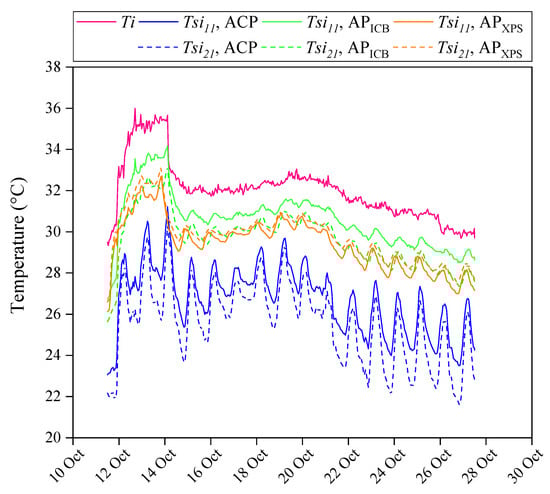 The present results are consistent with the previous section in terms of heat flux variation. A similar oscillation pattern can be evidenced in the three panels studied. Moreover, the inner surface temperature curves of APICB and APXPS are also nearly overlaid, as was expected given the results obtained for the heat flux curves. For the same indoor and outdoor temperature conditions, higher surface temperature values are obtained for panel solutions with higher thermal resistance values.