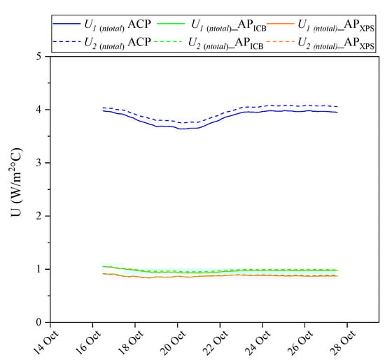 Considering that two heat flux sensors were used to define q1(n) and q2(n), it was also possible to estimate two heat transfer coefficients, U1(ntotal) and U2(ntotal), as illustrated in Figure 17. It is worth mentioning that U(ntotal) values were calculated five days after the start of the experimental test. In this way, the stabilization of the system is guaranteed. However, in the period from October 16 to 22, a slight depression can be observed in the heat transfer coefficient curves for the ACP sample. This can be explained by the fact that for the same period, shorter Te peaks were identified in Figure 15, as outdoor conditions cannot be controlled, the differential of temperature was altered, and, consequently, heat fluxes were also affected. Since the other two panels, APICB and APXPS, are composed of the thermal insulation layer, this change was not so perceptible.