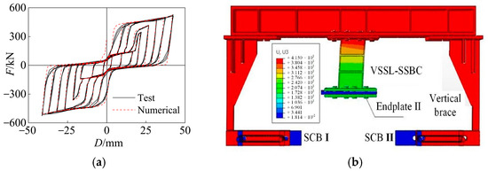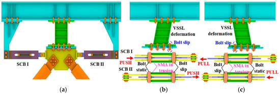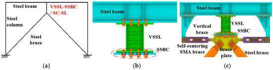 - The experimental and finite element results demonstrate that the SC-SL has a significant improvement in both the ultimate bearing capacity and energy dissipation capacity compared with the VSSL-SSBC. Moreover, due to the function of the SCB, it exhibits an excellent self-centering capacity.