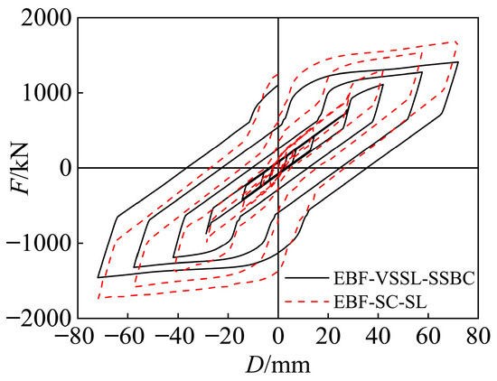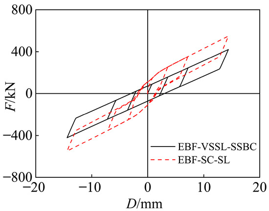 - Under rare earthquakes, the bearing force and stress of the brace of the EBF-SC-SL are slightly increased compared with EBF-VSSL-SSBC. Its ultimate load capacity is enhanced by 19.66%, and the residual deformation is reduced by 27.90%. This improvement contributes to the seismic resilience capacity of the EBF.