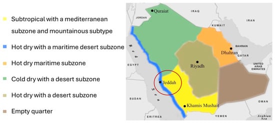 24]. Jeddah City is in the hot–dry maritime subzone, characterized by a hot and dry climate. This climate zone exhibits several distinct features: the summers are notably hot and dry, with dry bulb temperatures (DBTs) often exceeding 43 °C, and the average maximum DBT reaches approximately 40 °C. The average monthly DBT is around 33 °C, while the wet-bulb temperature (WBT) averages 16.5 °C. The average relative humidity hovers around 19%. Additionally, Jeddah experiences an annual mean wind speed of 3.39 m/s, contributing to generally calm weather conditions throughout the year. Seasonal variations in climatic conditions are evident, with June recording peak average high temperatures of 33.5 °C, compared to cooler average lows of 25.7 °C in January. Annual precipitation levels are minimal, ranging from 1 mm to 19 mm, with the least rainfall occurring in June and the most during winter [