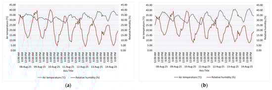 Figure 3 illustrates the variations in air temperature and relative humidity over seven days in two different settings. In