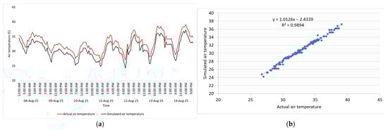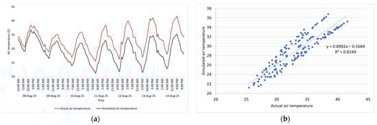 Figure 6 compares the simulated indoor temperatures with actual measurements for the ladies’ and gents’ majlis. The results indicate a strong alignment between the two datasets. A statistical evaluation was conducted to quantify the differences, revealing R