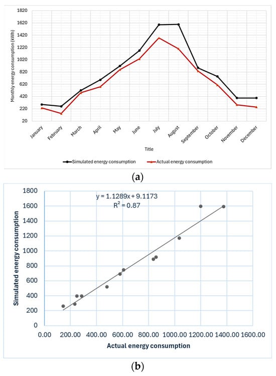 Figure 6a. The model’s performance was assessed following ASHRAE Guideline 14, utilizing CV(RMSE) and NMBE as evaluation metrics. The CV(RMSE) was determined to be 22.4%, well within the recommended threshold of 30% for monthly calibration, indicating an acceptable level of variability in prediction errors. In contrast, the NMBE was calculated at −18.6%, surpassing the guideline’s 10% benchmark and indicating a systematic trend of overprediction. This bias was particularly evident during winter months, such as February and December, potentially reflecting an overestimation of heating loads or infiltration rates. Despite the deviation in NMBE, the model demonstrated a robust R