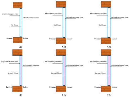 Figure 7 illustrates cross-sectional diagrams of the six analyzed PC window configurations. The configurations analyzed include a baseline case (BC) featuring standard clear glass and six optimized options (O1–O6), which integrate advanced technologies such as PC glazing with air gaps and aerogel-based glazing.