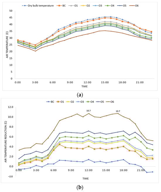 Figure 8b). During early morning (03:00), when outdoor temperatures are lower, O6 still shows a notable improvement, reducing indoor temperatures from 24.94 °C (BC) to 20.30 °C, a 4.64 °C reduction (18.6%). Over the day, BC’s average indoor air temperature is approximately 38.43 °C. In contrast, O6 achieves an average temperature of 30.09 °C, translating to a daily reduction of 8.34 °C, or approximately 21.7%. PC options (O1–O3) also offer meaningful improvements, with daily average reductions ranging from 2.86 °C for O1 (7.4%) to 4.73 °C for O3 (12.3%).