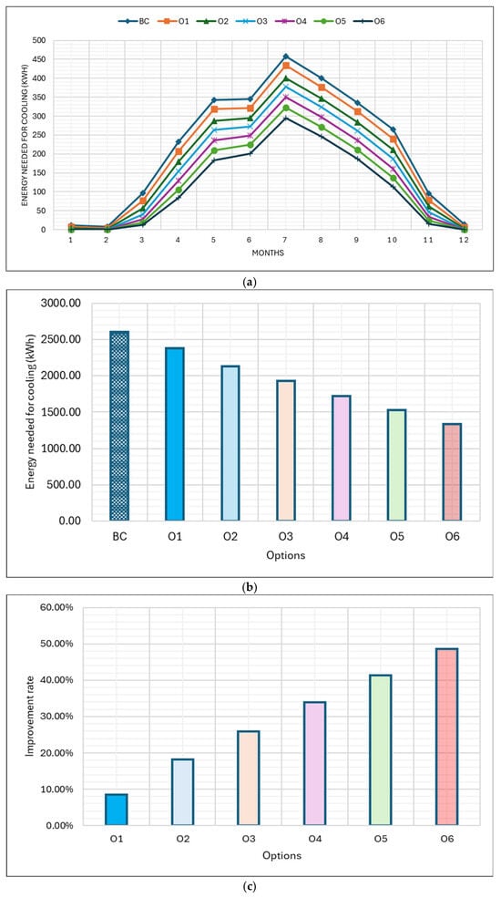 On an annual scale, cooling energy demand consistently decreases as glazing configurations advance from BC to O6. The base case registers the highest annual cooling energy requirement at 2602.27 kWh, while O6 demonstrates the most significant reduction, requiring only 1337.63 kWh (