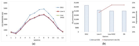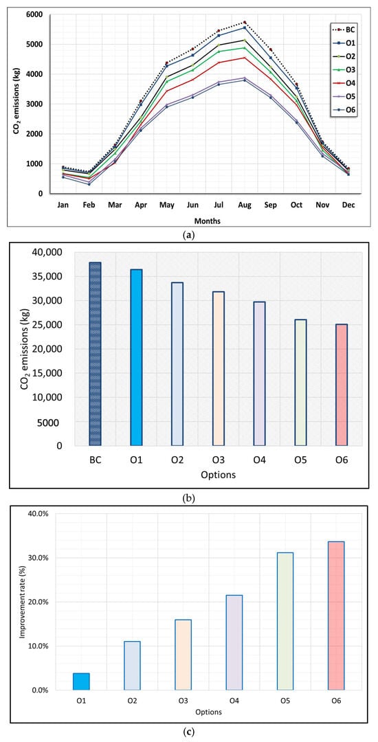 Figure 11b. O1 reduces emissions by 1447.87 kg (3.8% improvement), indicating modest gains over BC. Meanwhile, O4, with an annual reduction of 8144.28 kg, achieves a notable 21.5% improvement. The impact of O6 is particularly noteworthy, as it combines efficiency enhancements across all months to deliver the most pronounced reductions (