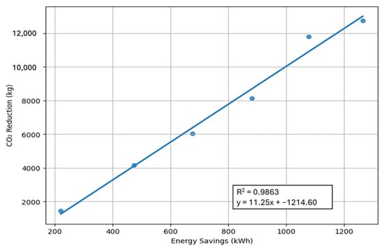 Figure 12). The derived regression equation showed that each kilowatt-hour saved corresponds to an approximate reduction of 11.25 kg in CO