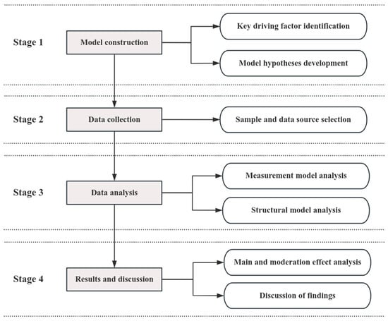 To mitigate potential common method variance during data collection, we have implemented several precautionary measures. Firstly, we employed back-translation and pilot testing to refine the questionnaire items, ensuring the accuracy and clarity of the questions. Secondly, we structured the questionnaire so that items measuring dependent variables preceded those assessing other variables to prevent respondents from being influenced by previous questions. Furthermore, we assured participants of the confidentiality of their responses and explicitly stated that the data collected would be used solely for academic research purposes. Additionally, through the use of exploratory factor analysis (EFA) and by employing Harman’s single-factor test to examine common method variance (CMV), four factors were extracted. The percentage of variance explained by the first factor was 22.87%, which is below the 40% threshold []. Hence, the presence of CMV was considered acceptable.