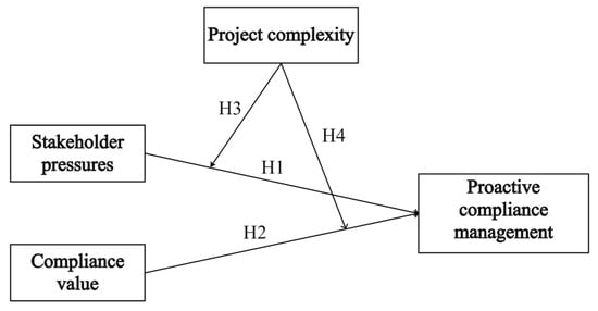 Strategic cognition theory posits that organizations adapt to and respond to environmental changes through processes involving information gathering and strategic decision making []. Existing scholarship has identified the pivotal role of external stakeholder pressures in effectually propelling organizations towards the integration of sustainability management mechanisms within their operational frameworks [,]. Contractors recognize that adherence to globally recognized standards of compliance management not only serves to mitigate legal risks, but also plays a pivotal role in enhancing their corporate reputation and fostering trust among clients, thereby facilitating sustainable business growth [,]. Stakeholder pressures directly influence the strategic alignment of compliance management with external expectations [,]. This necessitates a continuous focus on stakeholder feedback and their evolving expectations, prompting contractors to make ongoing enhancements and optimizations to their compliance management systems in response to real-world scenarios. The ability to continually improve is essential for contractors to maintain a competitive edge in a complex and ever-changing external environment. Consequently, stakeholder pressures serve as a cognitive impetus for contractors, propelling them to adopt more proactive compliance management strategies. By actively identifying and proactively preventing compliance risks during project execution, contractors demonstrate a commitment to upholding ethical standards and regulatory requirements, thereby fostering a culture of compliance and risk mitigation within the organization. We believe that the possibilities presented by the use of proactive compliance strategies by international construction contractors will be expanded due to stakeholder pressures.