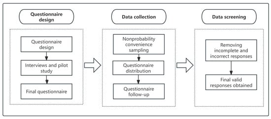As the primary focus of this study was to assess the driving mechanisms of proactive compliance management strategies for international construction contractors, the studies reviewed identified that the preliminary studies should focus on one country rather than confounding the findings and introducing contextual influences related to the national culture and industry []. In the context of China’s Belt and Road Initiative (BRI), Chinese international contractors have become significant players in global infrastructure markets, comprising 32.4% of the world’s top 250 contractors in 2024 [] (ENR, 2024). As one of the most prominent emerging market countries, China presents not only substantial opportunities, but also considerable compliance-related challenges for global enterprises. Consequently, China provides a distinctive context for this study. The data collection process is shown in Figure 3. To enhance data validity, the questionnaire design incorporated established methodological safeguards, namely sensitive terminology was systematically avoided to mitigate response bias []. A rigorous forward–backward translation protocol was implemented for cross-linguistic accuracy verification, involving professional linguists and domain experts [].