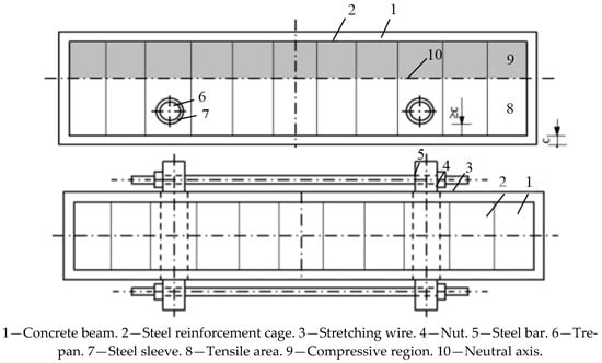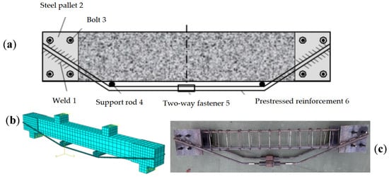 As the service life of engineering structures increases, there is a concomitant deterioration in their structural resilience, which leads to cracks, spalling, and other forms of damage. However, these structures do not yet meet the criteria for demolition or scrapping [1,2,3,4,5]. Consequently, the implementation of a reinforcement method is recommended in order to sustain their load-bearing capacity. However, it should be noted that the conventional reinforcement approach results in an augmentation of the dead weight of the beam, thereby exerting an adverse effect on the stability and functionality of the original structure. This requires removing stressed components or making major structural modifications, which in turn has a detrimental effect on the intended utilization [6,7,8,9,10]. In this study, a novel external prestressed reinforcement technique for the side façades of a beam was invented (ZL 2019 2 1264085.9) [11], which is characterized by its simplicity in terms of construction and cost-effectiveness. This technology facilitates the online strengthening of damaged components without increasing the structure’s self-weight, thereby enhancing the cracking resistance, bearing capacity, stiffness and stability of the components. Additionally, it reduces the deformation of the components, ensuring enhanced safety and reliability of the structure. The technology has been demonstrated to reduce the frequency and costs of post-maintenance repairs, operation and maintenance.