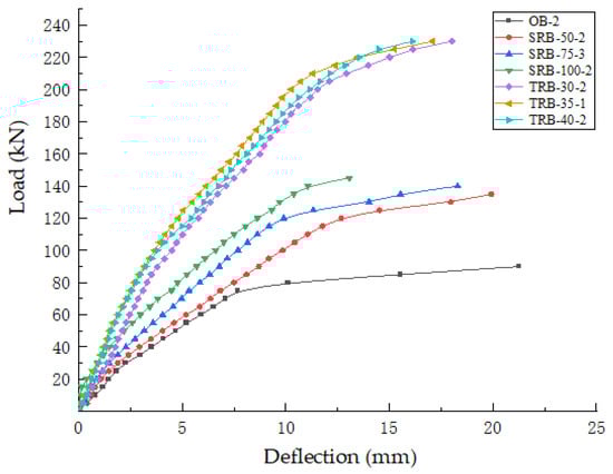As demonstrated in Table 3, the experimental findings reveal that, in comparison with the OB, the bearing capacities of the SRBs are enhanced, while those of the TRBs are notably elevated. Furthermore, it is evident that the bearing capacities of both prestressed reinforcement methods are substantially augmented with the increasing initial external prestressed stress.