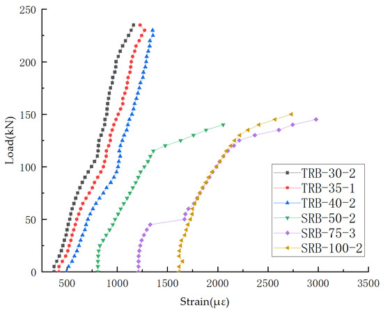 As illustrated in Figure 10, the external load–strain curves of the prestressing tendons of the test beams reveal that, while the initial prestress values of the SRB beams exceeded those of the TRB beams, the strain growth rates of the prestressed tendons of the SRB beams surpassed those of the TRB beams. This phenomenon can be attributed to the lower cracking loads of the SRB beams compared to those of the TRB beams, resulting in more significant crack expansion and, consequently, higher strain increments in the prestressed tendons. Overall, the stress levels of the prestressed tendons remained relatively low.