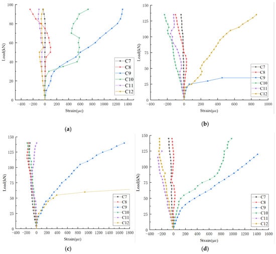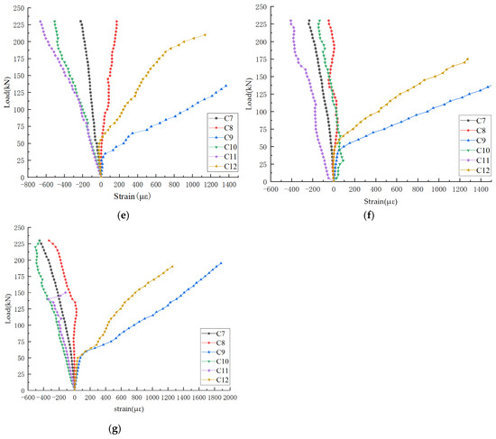 In Figure 11, the load–strain curves of the concrete in the shear span area are shown, with the measuring points distributed along the connection between the loading point and the support (Figure 5, Figure 6 and Figure 7). The analysis of the curves reveals significant variations in the stress characteristics of the concrete in the shear span zone. The concrete below the neutral axis of the concrete beam is in a tensile state, while the concrete above the neutral axis of the concrete beam is in a compressive state. This is consistent with the typical stress characteristics of concrete beams. With an increase in load, the tensile stress in the middle tensile zone of the beam span increases, which eventually leads to the cracking of the concrete, and the concrete near the support continues to bear greater compressive stress. In terms of the strain distribution, the critical zero point strain of the concrete in the beam span can be further predicted. The zero point strain is defined as the strain point at which the concrete transitions from compression to tension. It is typically located between the middle span and the support.