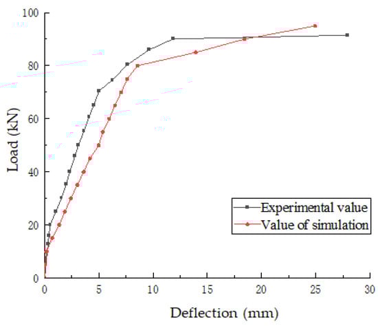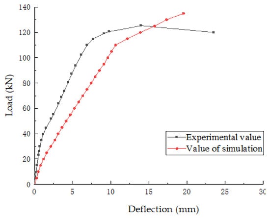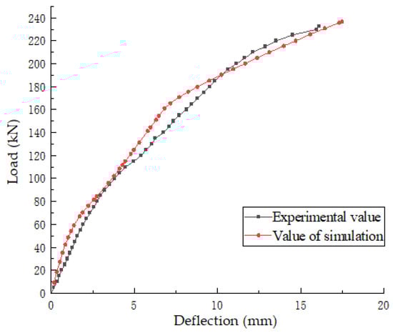 In Figure 13, the load–displacement curves of the test values and simulated values of OB-2 are presented. The deformation of the test beam is found to be essentially congruent with the simulation results, thereby validating the adequacy of the selected model.