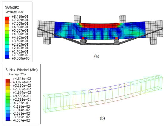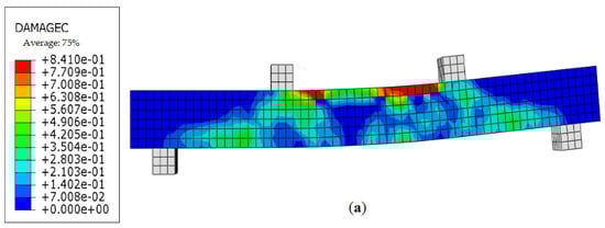 As illustrated in Figure 14, the compression damage diagram of the concrete under the ultimate load of OB-2 demonstrates that when the upper concrete reaches its ultimate compressive strength, it undergoes cracking, a phenomenon that is consistent with the observations made during the test. Figure 14b,c presents the stress contour of the concrete beam reinforcement and the tensile damage stress contour of the concrete under the limit state. A comparison of this diagram with the actual crack distribution diagram reveals that the position and shape of the oblique cracks are consistent.