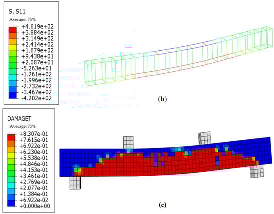 OB-2 numerical simulation diagrams. (a) Stress contour of compressive damage of concrete beams. (b) Stress contour of reinforcement. (c) Compressive damage contour of concrete beam.